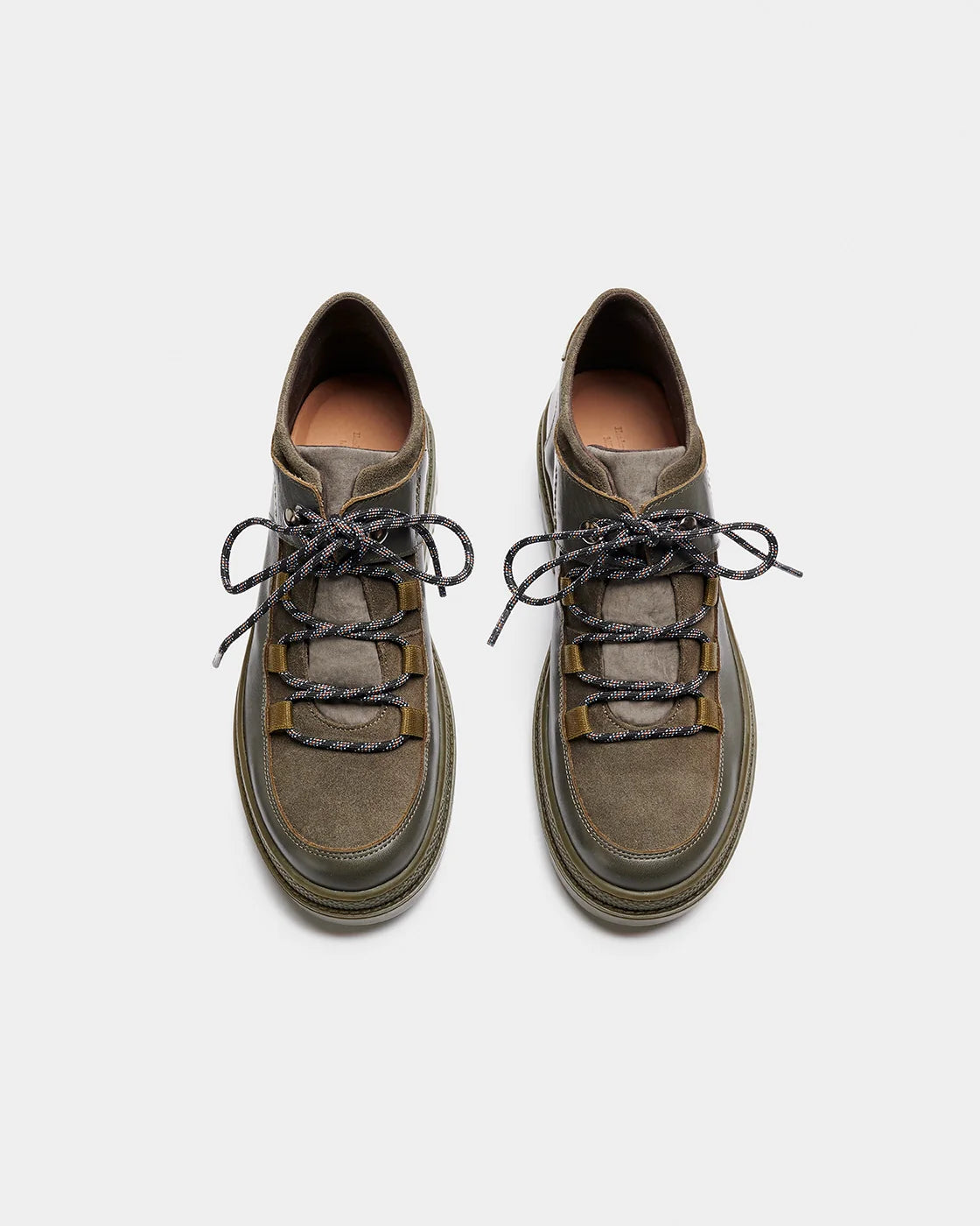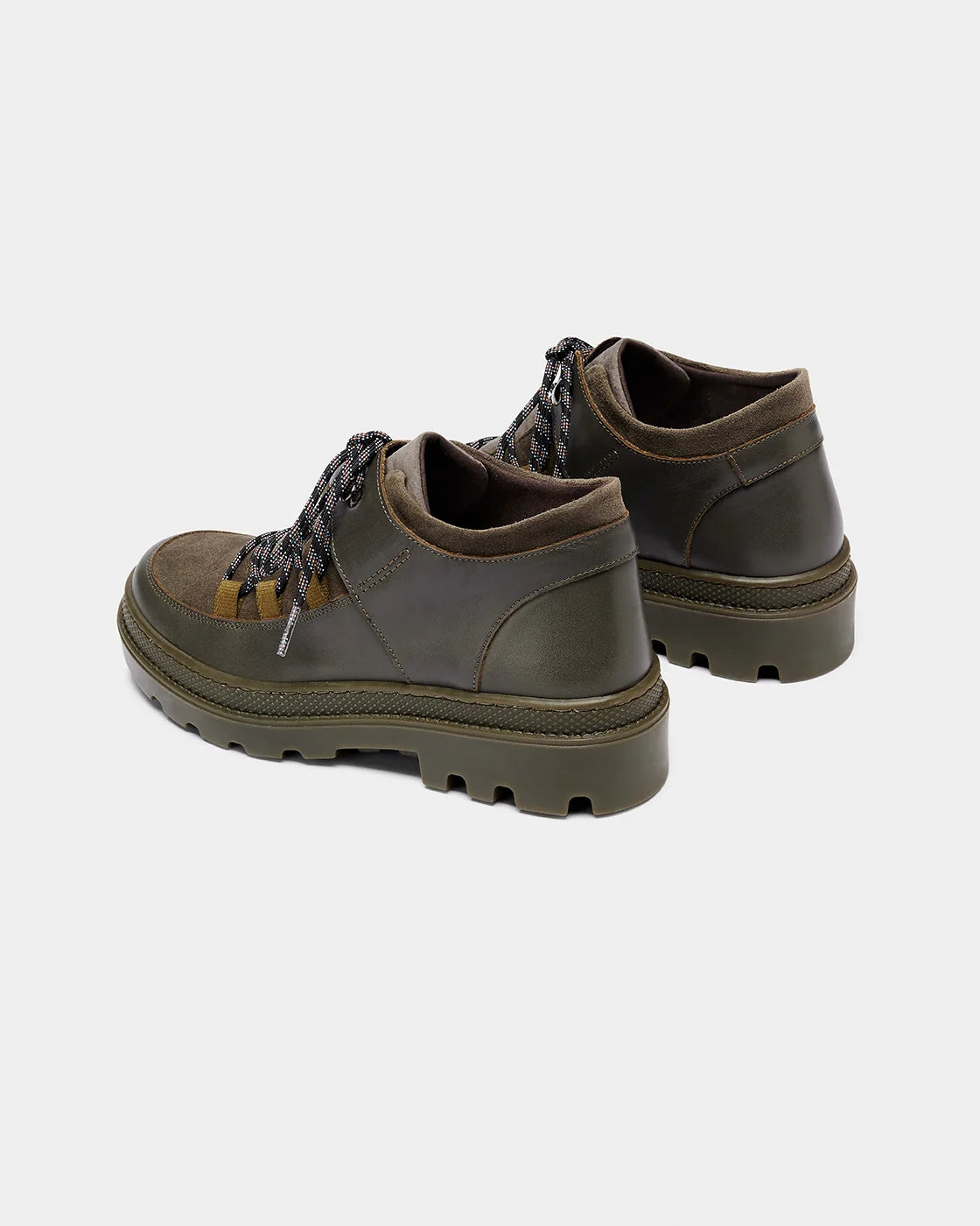 Abra is a flat boot inspired by mountain footwear. The uppers are a combination of cow leather, split suede and fabric. Thick track sole made of TR. Laces in contrasting colour. Fabric lining. Removable foam insole. The total height is 3.5 cm for greater back comfort.