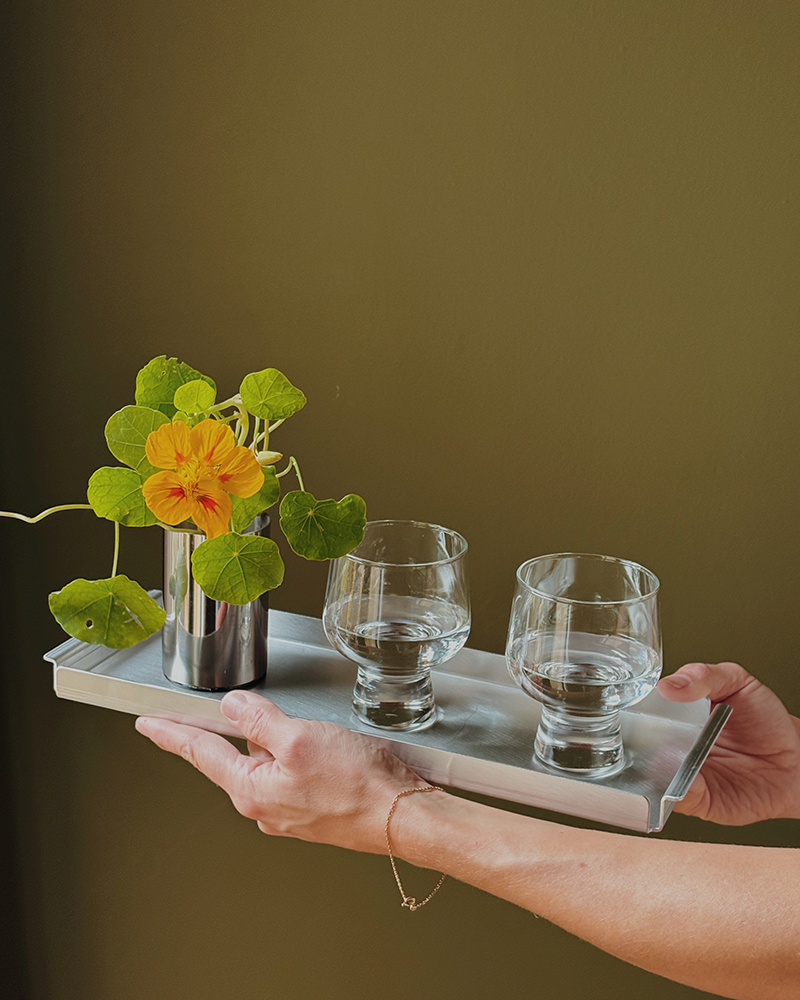 En enkel og funktionel bakke, bukket i hånden af vores lokale smed. Fremstillet i aluminium, hvilket giver et let, men robust udtryk, der både kan bruges i køkkenet, på spisebordet eller som dekorativ base. Det minimalistiske design og den håndværksmæssige kvalitet gør bakken til et tidløst stykke interiør, hvor materialets rene flader og skarpe linjer får lov til at tale for sig selv.