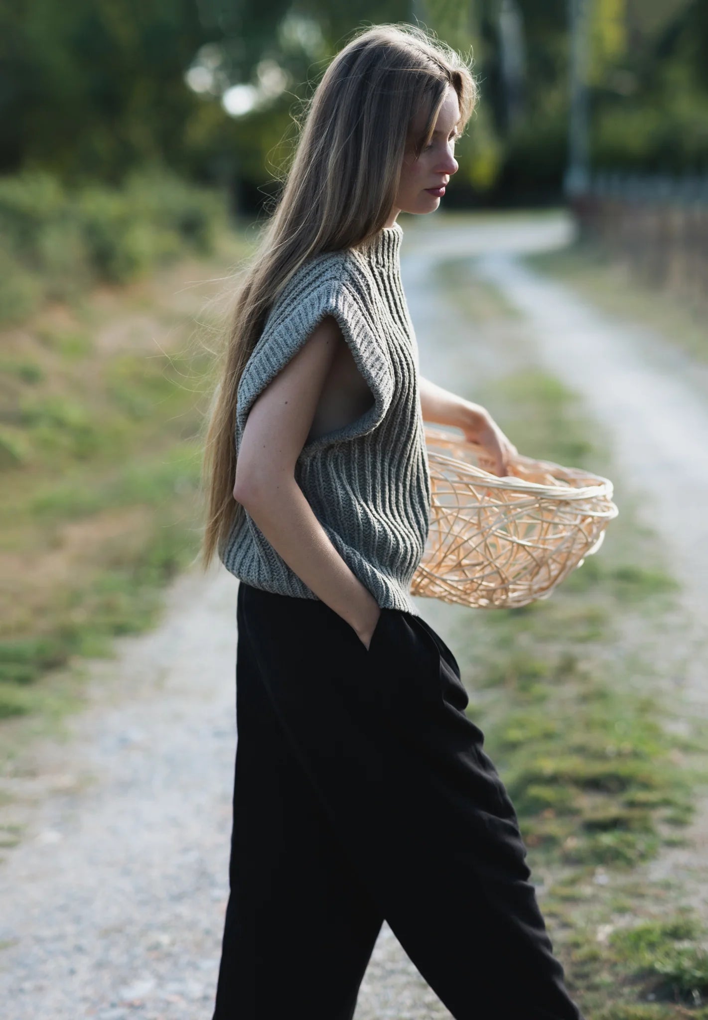 Our most season less piece is this textured vest knitted roomy cardigan knitted in double stitch with a beautiful sailor collar, front pockets and dropped shoulders.