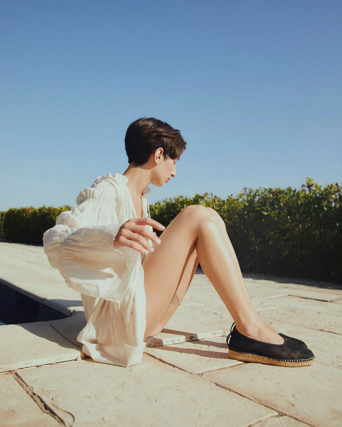Allium is a closed-toe pump with elastic binding. Lycra upper with cotton lining. The insole is cushioned with foam and lined with natural cowhide leather for better breathability. The curved sole is made of a single jute braid, a small wedge for increased comfort, and a non-slip rubber outsole. Total height of 3 cm.
